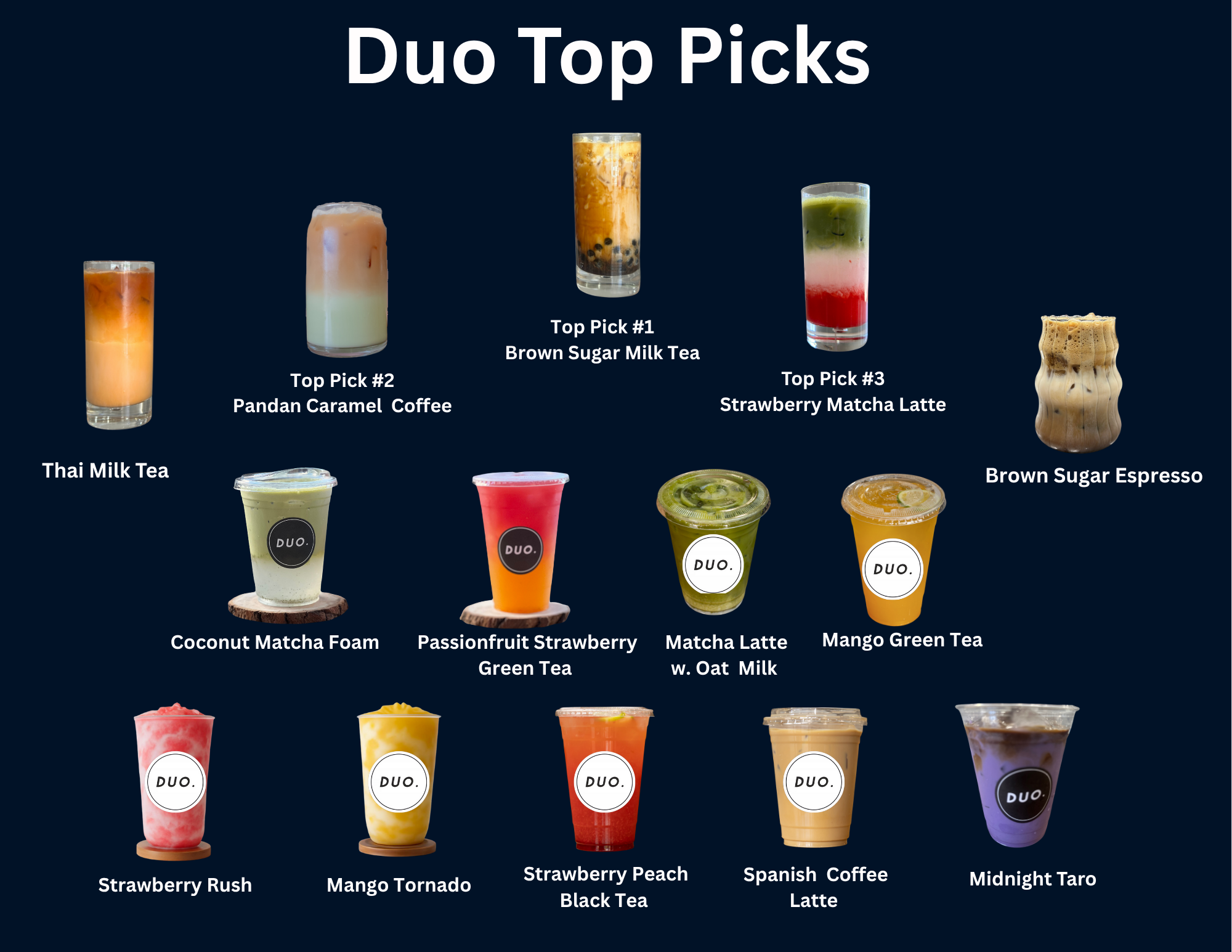 From bold espresso shots to smooth lattes, our coffee lineup highlights precision and depth. Signature creations like Midnight Taro, and Brown Sugar Espresso showcase Duo’s signature blend of tradition and innovation.